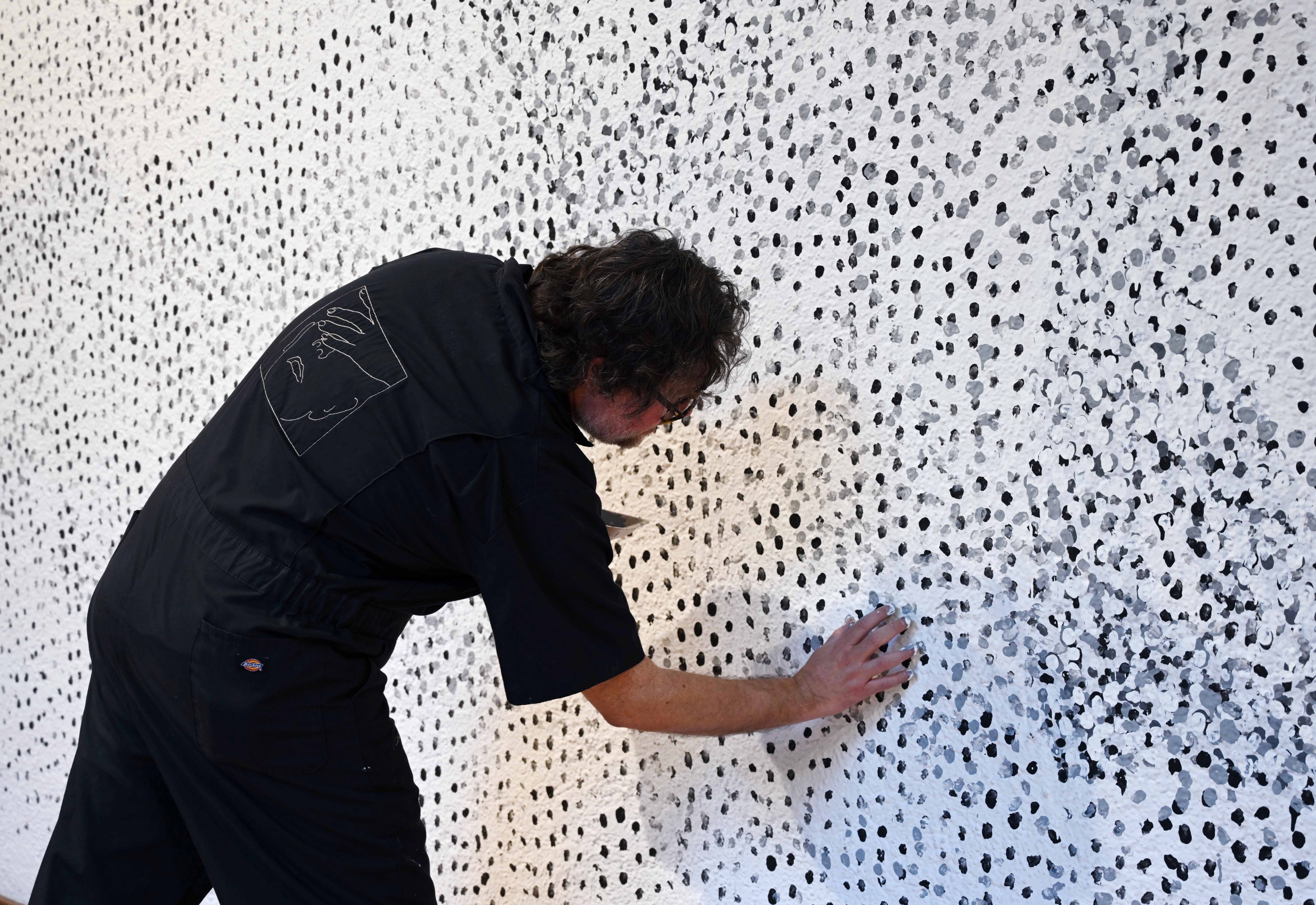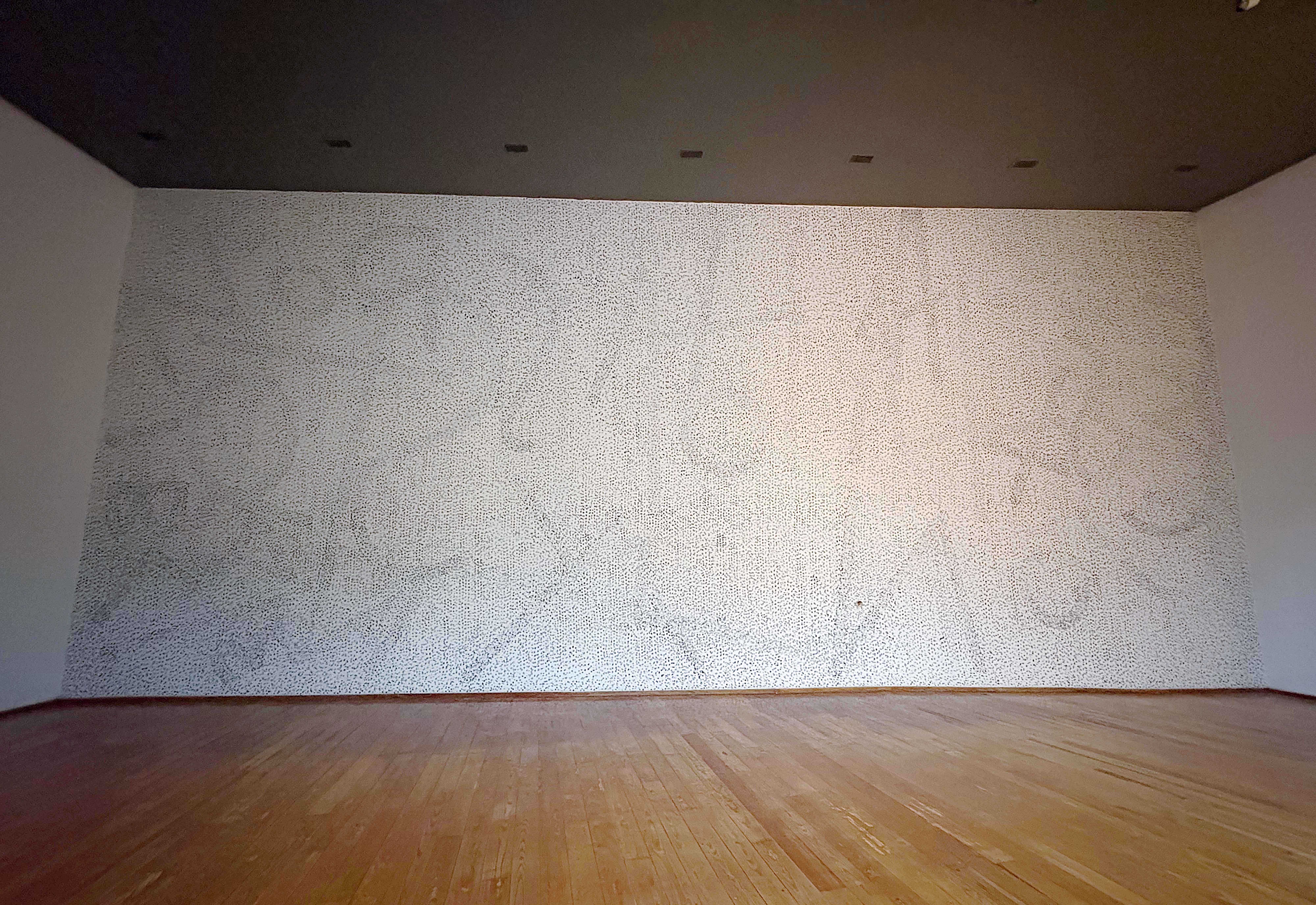 The story ceases to be available over the course of the sunset. The piece emerged from sketches that were translated onto the wall at different moments and, over time, became white noise.