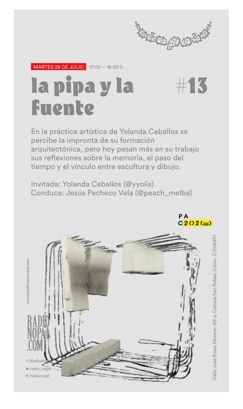Yolanda Ceballos speaks about her participation in the exhibition Any two things in the world are connected by a third. The secret is figuring out what that third thing is through the Pequod App for the show La pipa y la fuente of Radio Nopal.